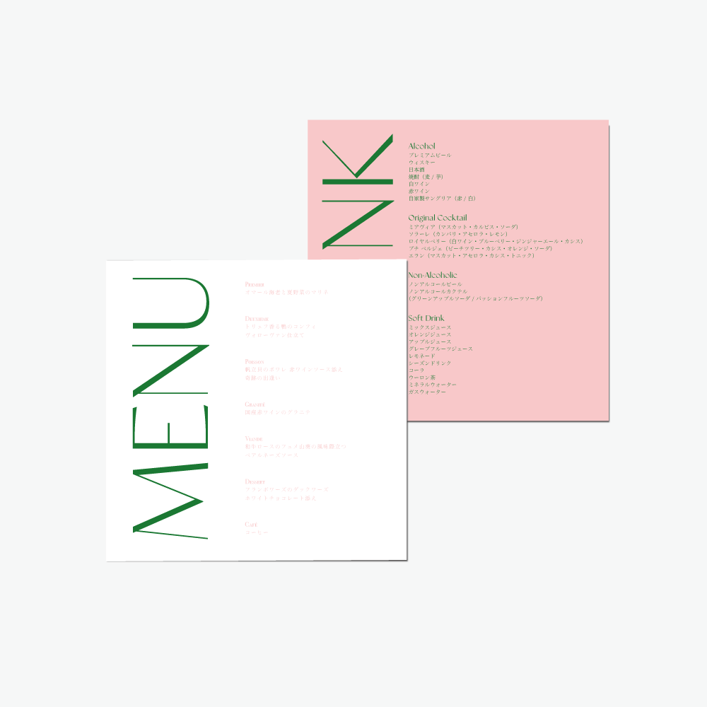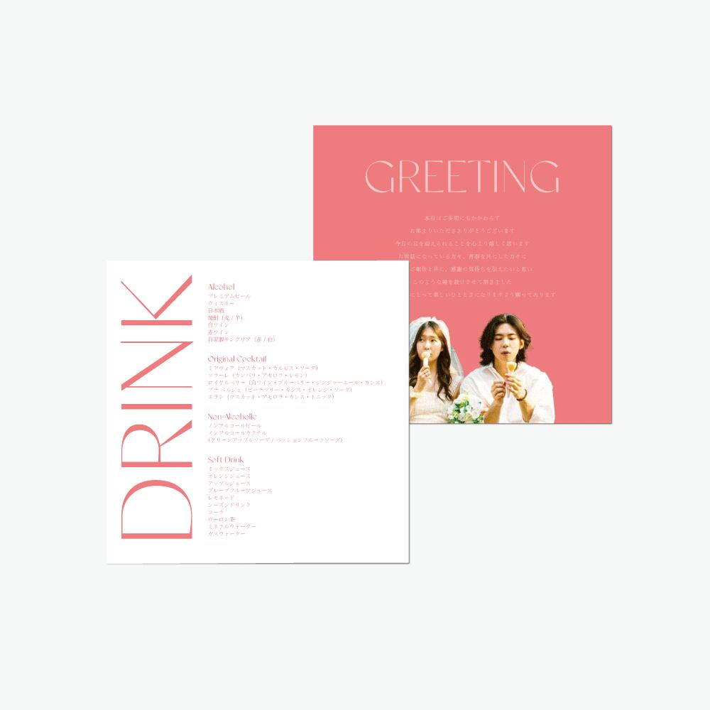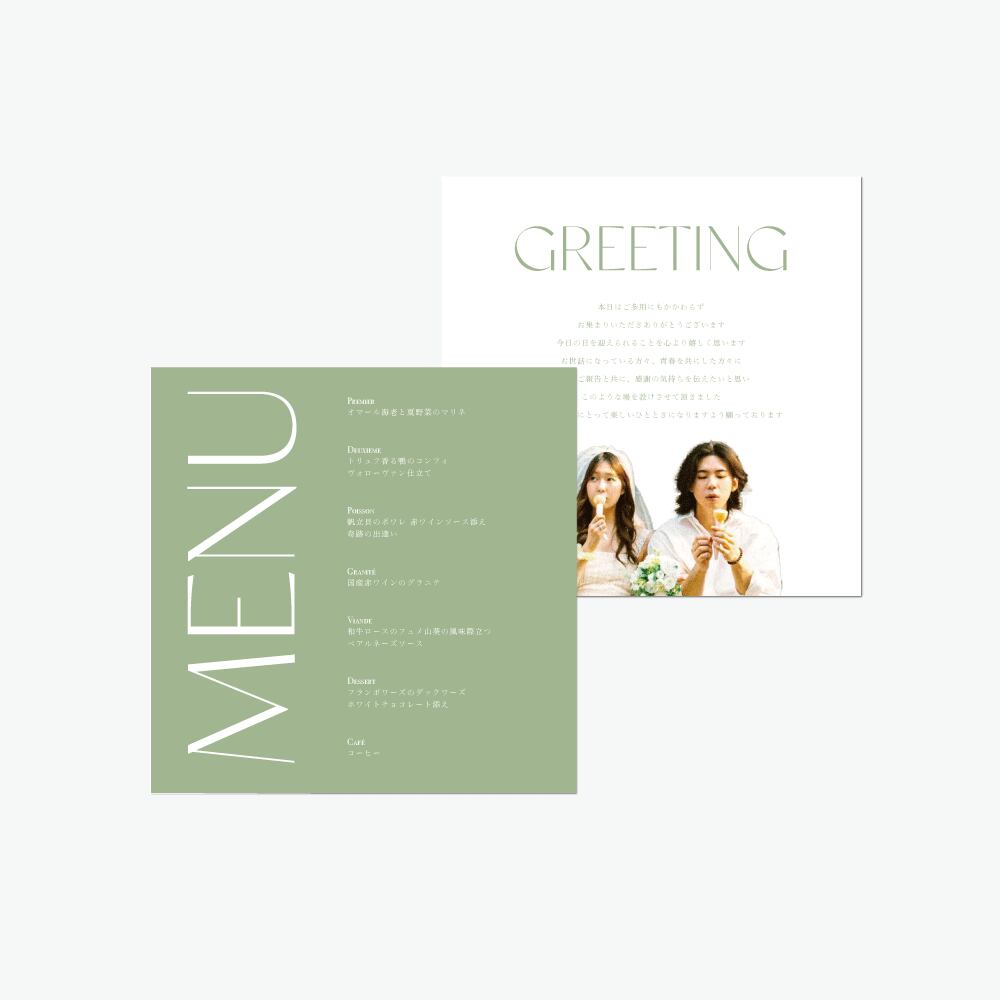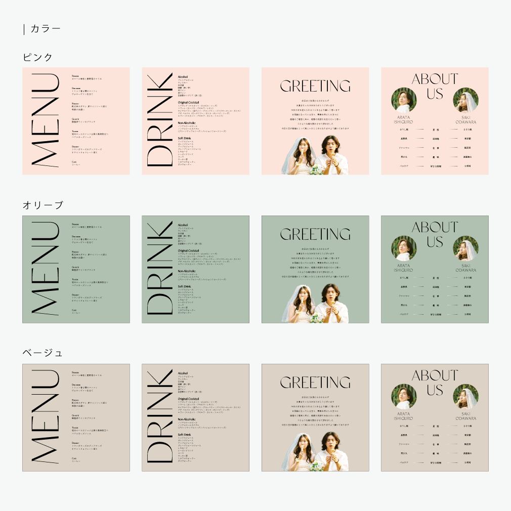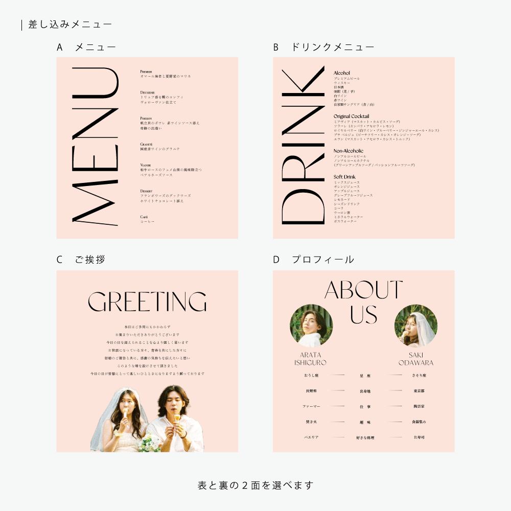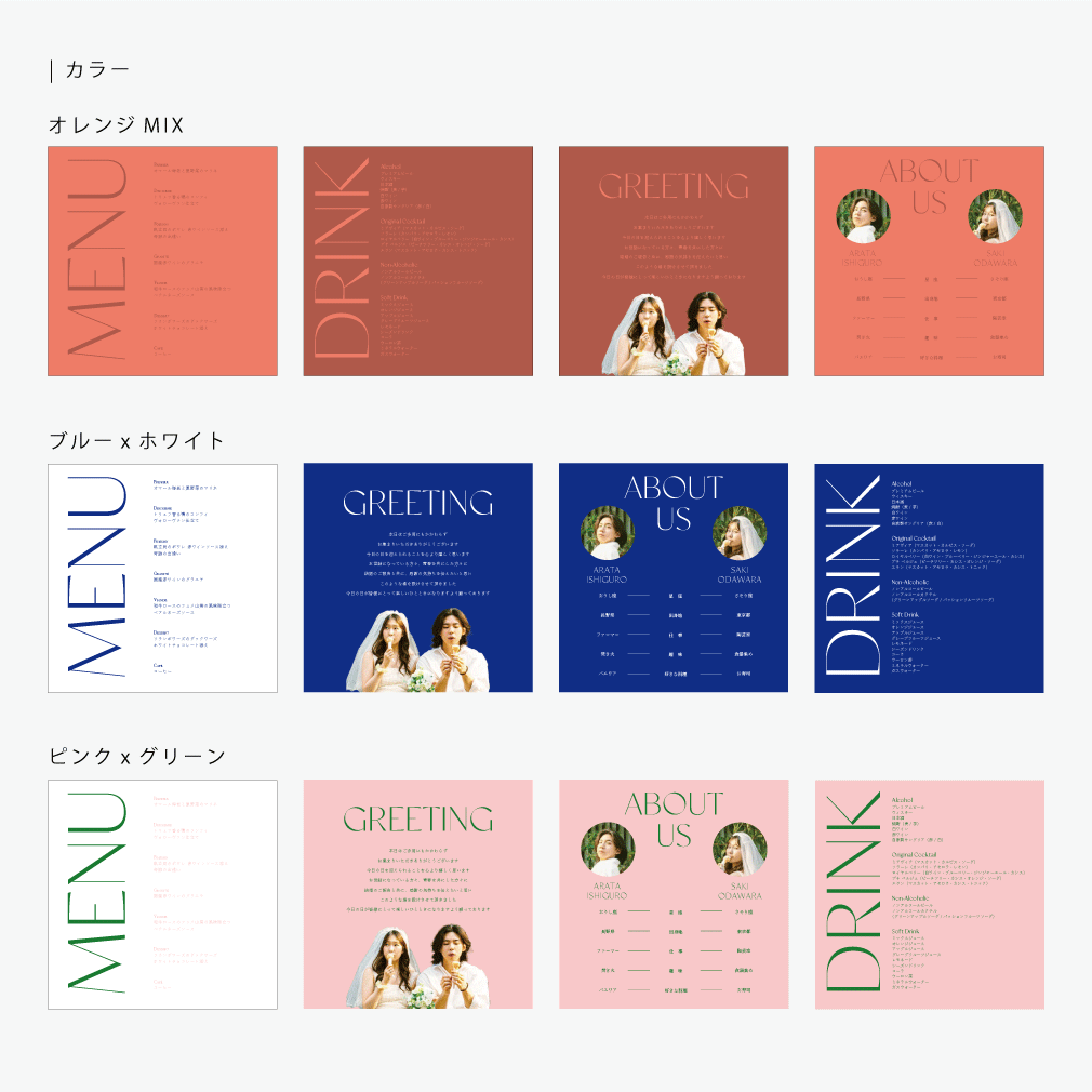 メニューはもちろんプロフィールやご挨拶など4種類から2パターン選べるので、席次表の代わりにもなります。